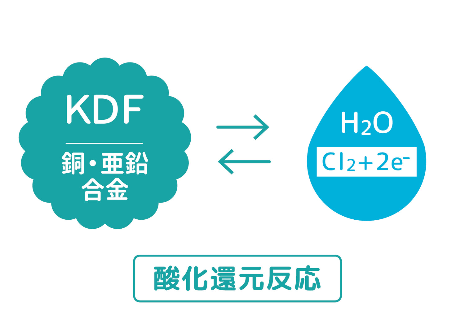 このKDFが電子を失う変化を”酸化”、塩素が電子を得る変化を”還元”といい、