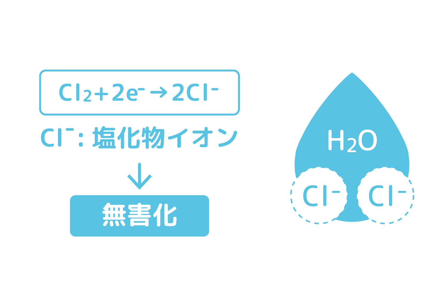 酸化還元反応により塩素は無害な2つの水溶性塩化物(塩化物イオン)へと変化します。